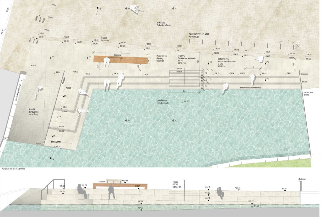 Vor diesem Hintergrund sowie der historischen Bedeutung des Stadtraums - Übergang von der Unterstadt zum oberen Domquartier – wurde ein ganzheitliches städtebaulich-freiraumplanerisches Gestaltungskonzept für den Stadtraum erstellt. Dieses umfasst die Gestaltung des oberen Abschlusses der Ufermauer einschließlich Geländer ebenso wie den Straßenraum.