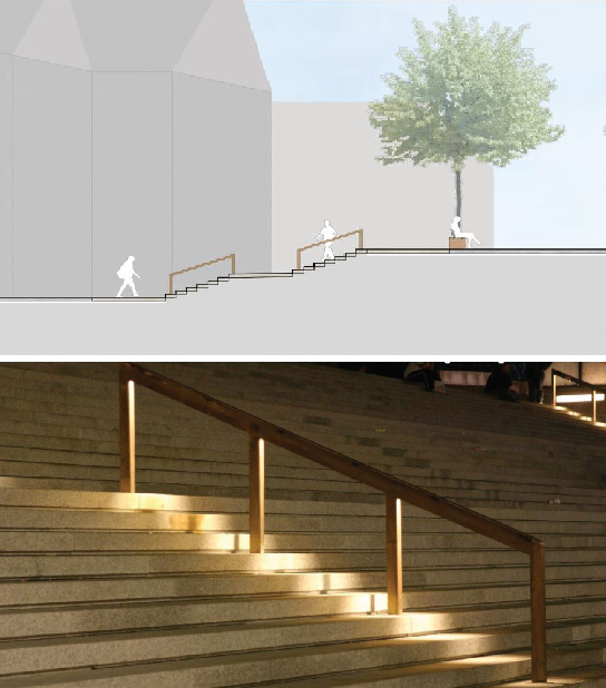 Das Geländer der Rampe besteht aus einer rahmenden Flachstahlkonstruktion mit einer filigranen Füllung aus sich verschränkenden Rundstäben, die denen der Baumschutzgitter entsprechen. Der Handlauf des Geländers ist auf einer Seite der Rampe beleuchtet.