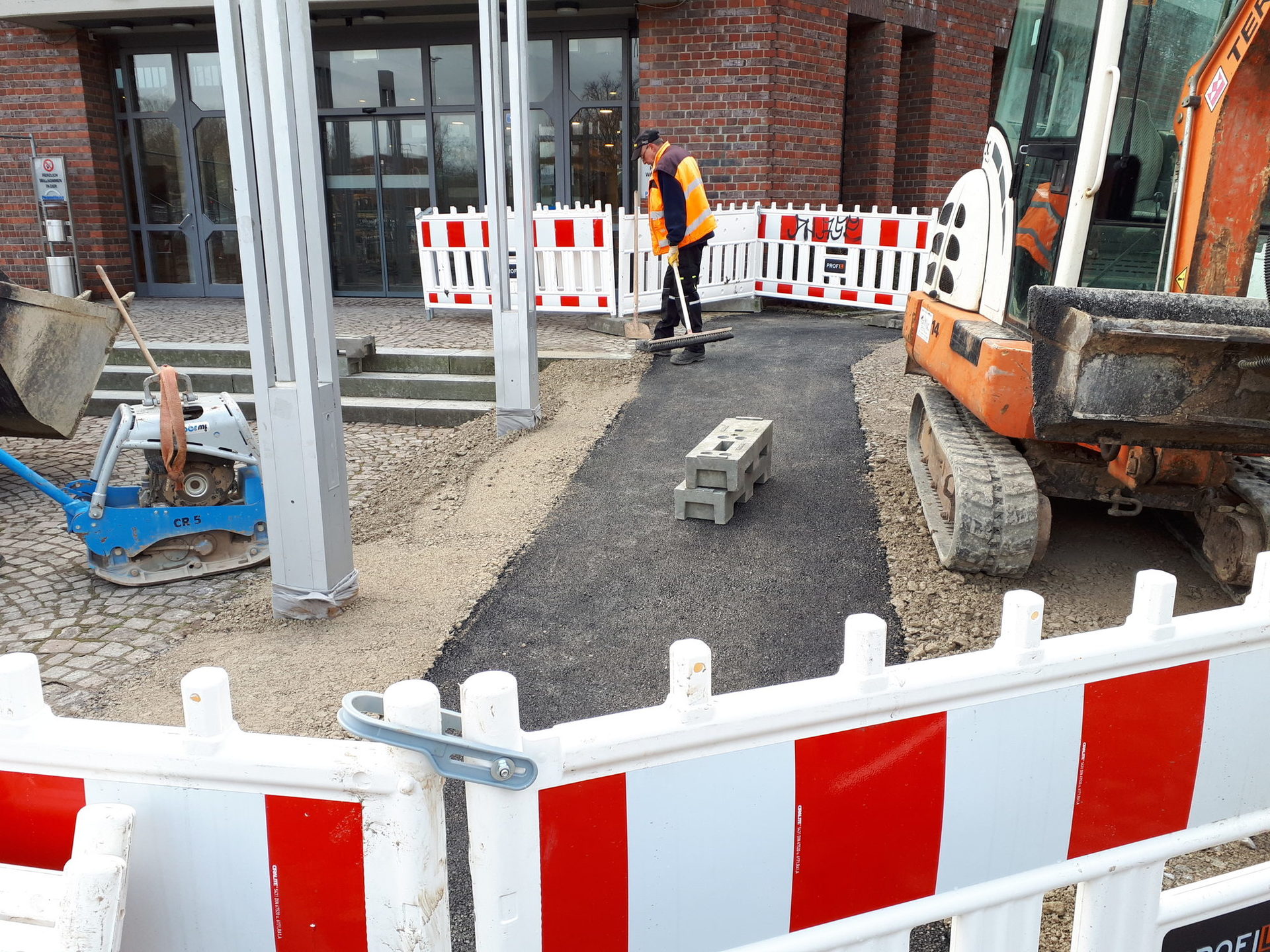 Die Tragschichtarbeiten auf dem Busstellplatz des Maspernplatzes gehen auf die Zielgerade. In den nächsten Tagen werden hier die Bordsteine für die Busbuchten gesetzt. Parallel beginnt teilweise der Umbau des Paderhallenvorplatzes. Der direkte Zugang zum Haupteingang bleibt allerdings zunächst erhalten. Der barrierefreie Zugang verläuft über eine provisorisch erstellte Rampe rechts vom Haupteingang.