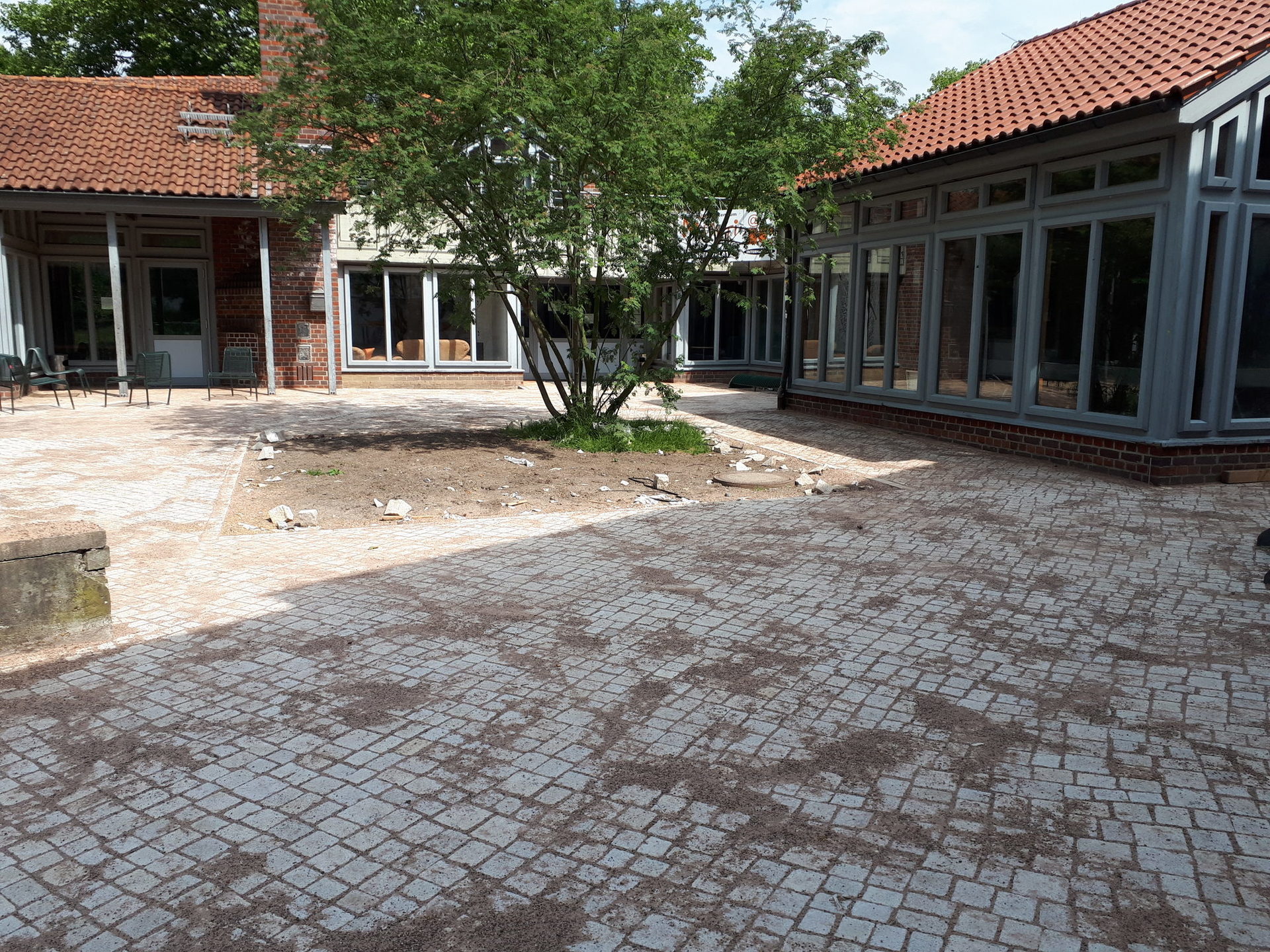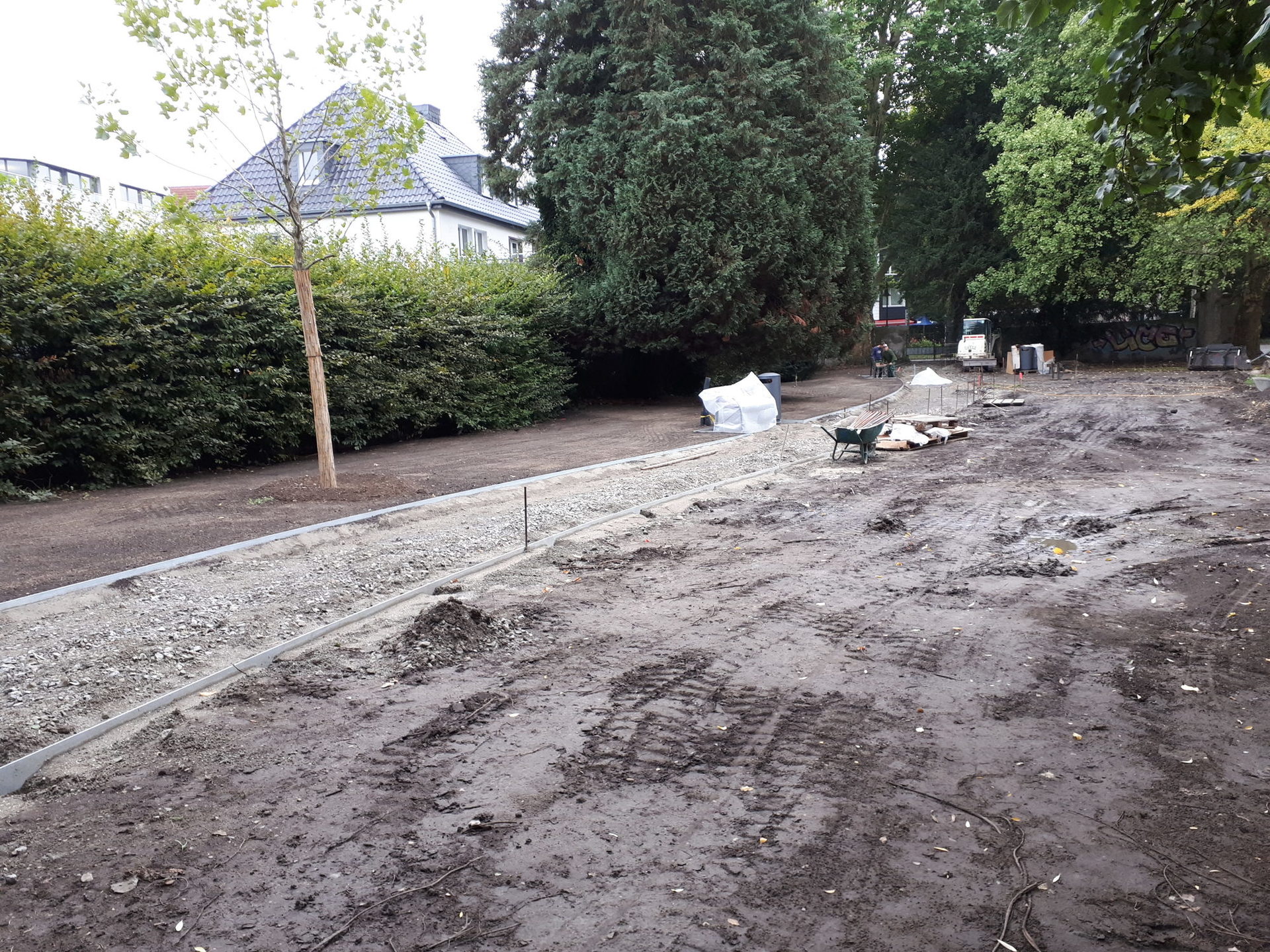 07.09.2018 - Die Arbeiten im Vorfeld der Paderhalle gehen auf die Zielgerade und es ist geplant den Vorplatz zeitnah freizugeben. Zur Zeit laufen hier die letzten Pflasterarbeiten und das Aufstellen von Bänken und Beleuchtung. Parallel wird im Haxthausengarten gearbeitet. Hier wird einer der beiden neuen Wege angelegt bevor der bisherige Durchgangsweg durch den Haxthausengarten gesperrt und abgebrochen wird. Die Wegeverbindung zwischen Maspernplatz und Mühlenstraße erfolgt dann über den neuen Weg an der östlichen Grenze des Haxthausengartens.