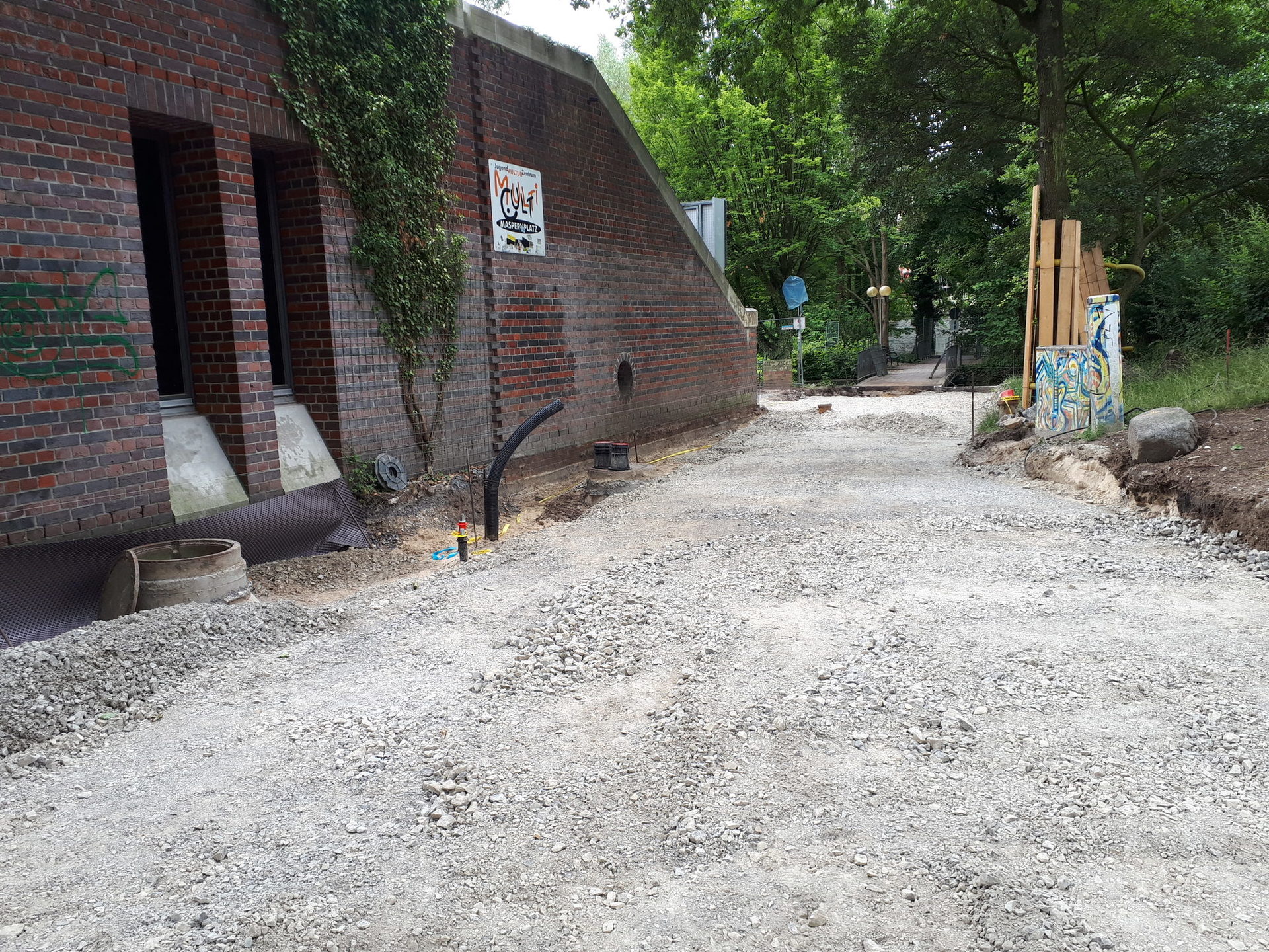 Fortgesetzt werden die Arbeiten entlang der Dielenpader. Der neue Weg aus Asphalt wird mit Pflastersteinen eingefasst.
