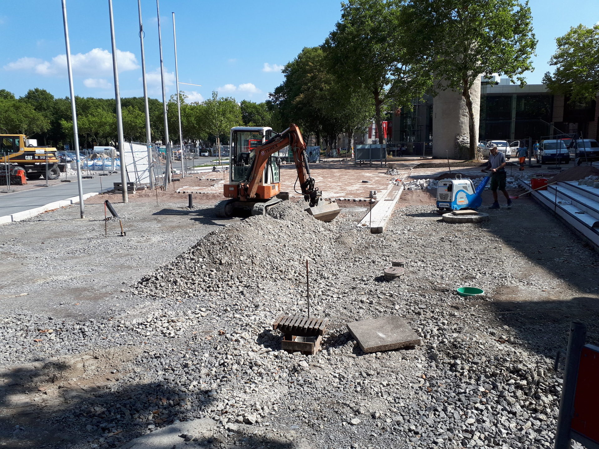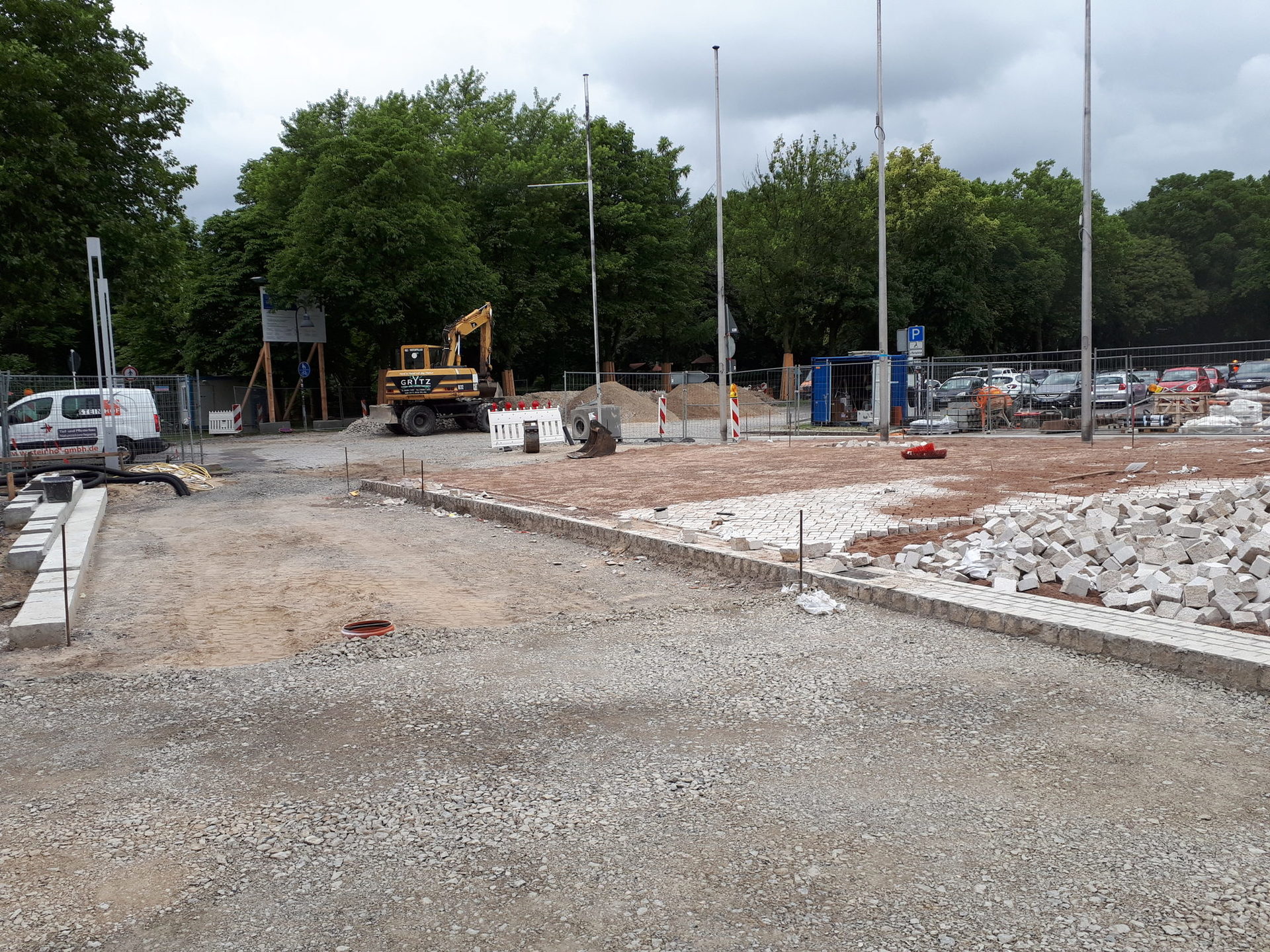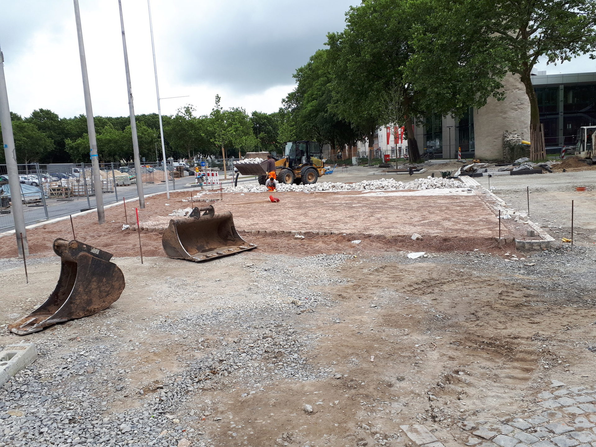 14.06.2018 - Nachdem die Leitungsbauarbeiten auf dem Vorplatz der Paderhalle weitestgehend abgeschlossen wurden, sind die Belagsarbeiten in vollem Gange. Zur Zeit laufen die Naturstein-Pflasterarbeiten sowie der Einbau von Tragschichten. Ende Juni erfolgt dann der Asphalt-Einbau für die Asphaltbänderung. Weiterhin bekommt dann der Busstellplatz seinen Asphaltdeckbelag. Danach kann der Busstellplatz für den Verkehr freigegeben werden.