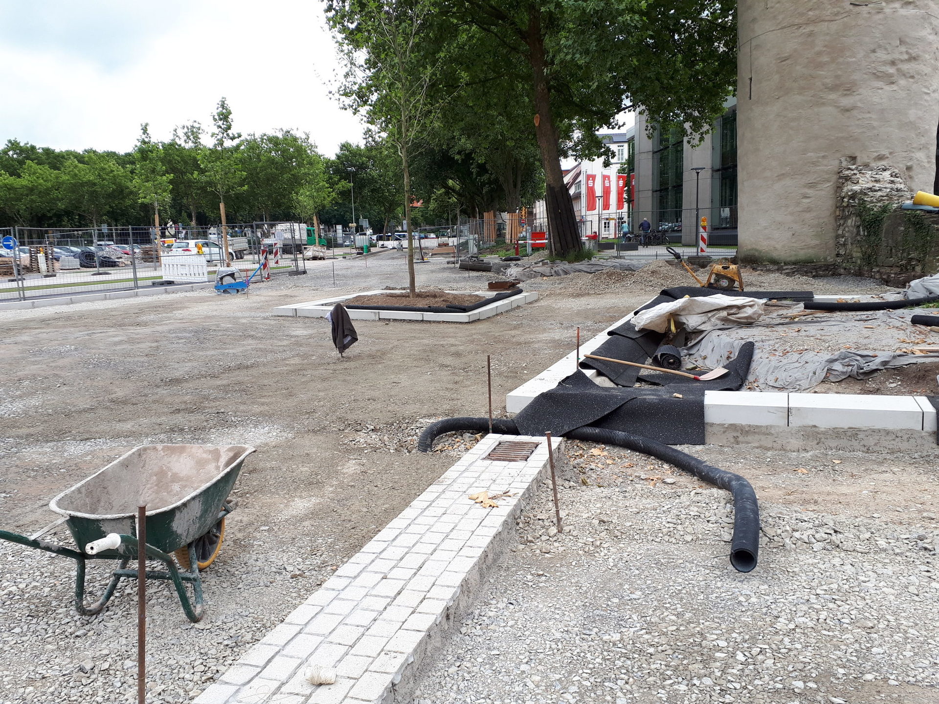 Aufgrund des engen Terminplans musste bereits in den Wochen vor der Weihnachtspause einiges im Umfeld der Paderhalle auf den Weg gebracht werden. So wurde ein neuer Kanal auf dem Maspernplatz verlegt, der zur Entwässerung der Pflasterflächen dient. Parallel werden die alten Busstellplätze abgerissen und bereits die neuen Bordsteine gesetzt. Anfang Januar geht es mit der Umgestaltung der Busstellplätze weiter.