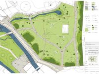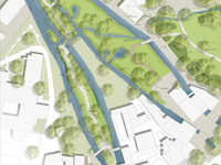 Es wird ein durchgängiges einheitliches Materialkonzept für die Beläge in der Flusslandschaft vorgeschlagen. Dieses trägt zu einer intuitiven Wahrnehmbarkeit des Gesamtzusammenhangs bei und stellt trotz unterschiedlicher Charaktere der Teilräume eine erkennbare übergeordnete Verzahnung her.
